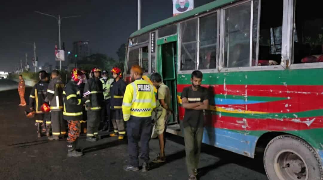 রাত দেড়টার দিকে আল্লাহ ভরসা নামের ওই বাসটিতে আগুন জ্বলতে দেখে স্থানীয়রা। এসময় তারা পুলিশ ও ফায়ার সার্ভিসে খবর দেয়। আগুন বাসের কয়েকটি সিট পুড়ে গেছে।
