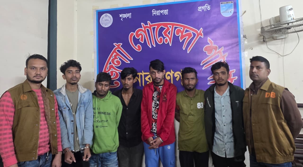 গ্রেফতারকৃতরা হলেন, মো: রনি সরকার (২২)কুড়িগ্রাম জেলার মাত্রপুর থানা এলাকার বাসিন্দা মৃত,আব্দুর রহিমের ছেলে ।বর্তমানে ফতুল্লা সোনালি মার্কেট এলাকায় বসবাস কওে ,শাহীন শাহজাদ(২৫)পটুয়াখালী জেলার গলাচিপা এলাকার মো:কবির হোসেনের ছেলে।বর্তমানে ফতুল্লা থানার উত্তর ভুইগড় এলাকায় বসবাস করে,ফয়সাল(২০)কুমিল্লা জেলার হোমনা থানার এলাকার মো: জালাল মিয়ার ছেলে।বর্তমানে সিদ্ধিরগঞ্জ খালপাড় এলাকায় বসবাস করে ।মো: একরাম হাসান (২০) নারায়ণগঞ্জ ফতুল্লার ভুইগড় এলাকার মো: মিজানুর রহমানেরছেলে ,মো: রাকিব (২০) ফতুল্লা কতুবাইল এলাকার মো: জালাল মিয়া ওমো:ববিন (২০)মাদারীপুর জেলার শিবচর থানা এলাকার মো: বাদশার ছেলে।বর্তমানে উত্তর ভুইগড় এলাকায় বসবাস করে ।