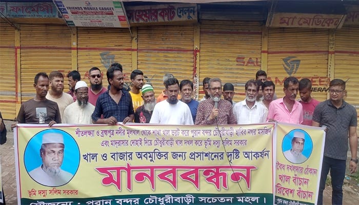 মানববন্ধনে বক্তরা বলেন, শীতলক্ষ্যা ও ব্রহ্মপুত্র নদীর মূলখাল থেকে শাখা খাল ভরাট করে পুরান বন্দর চৌধুরীবাড়ী হাবিব নগর মসজিদ এবং মাদ্রাসার দোহাই দিয়ে চৌধুরীবাড়ি খাল দখল করেছে ভূমিদস্যু সেলিম ওসমানের দোসর সলিম সরকার। ফলে স্থানীয় এলাকাবাসী নানান সমস্যায় পড়তে হচ্ছে। স্থানীয় সচেতন মহল ভূমিদস্যু সলিম সরকারের হাত থেকে খালটি পুনরুদ্ধার এবং বাজার অবমুক্তির জন্য প্রশাসনের কাছে জোর দাবি জানান।