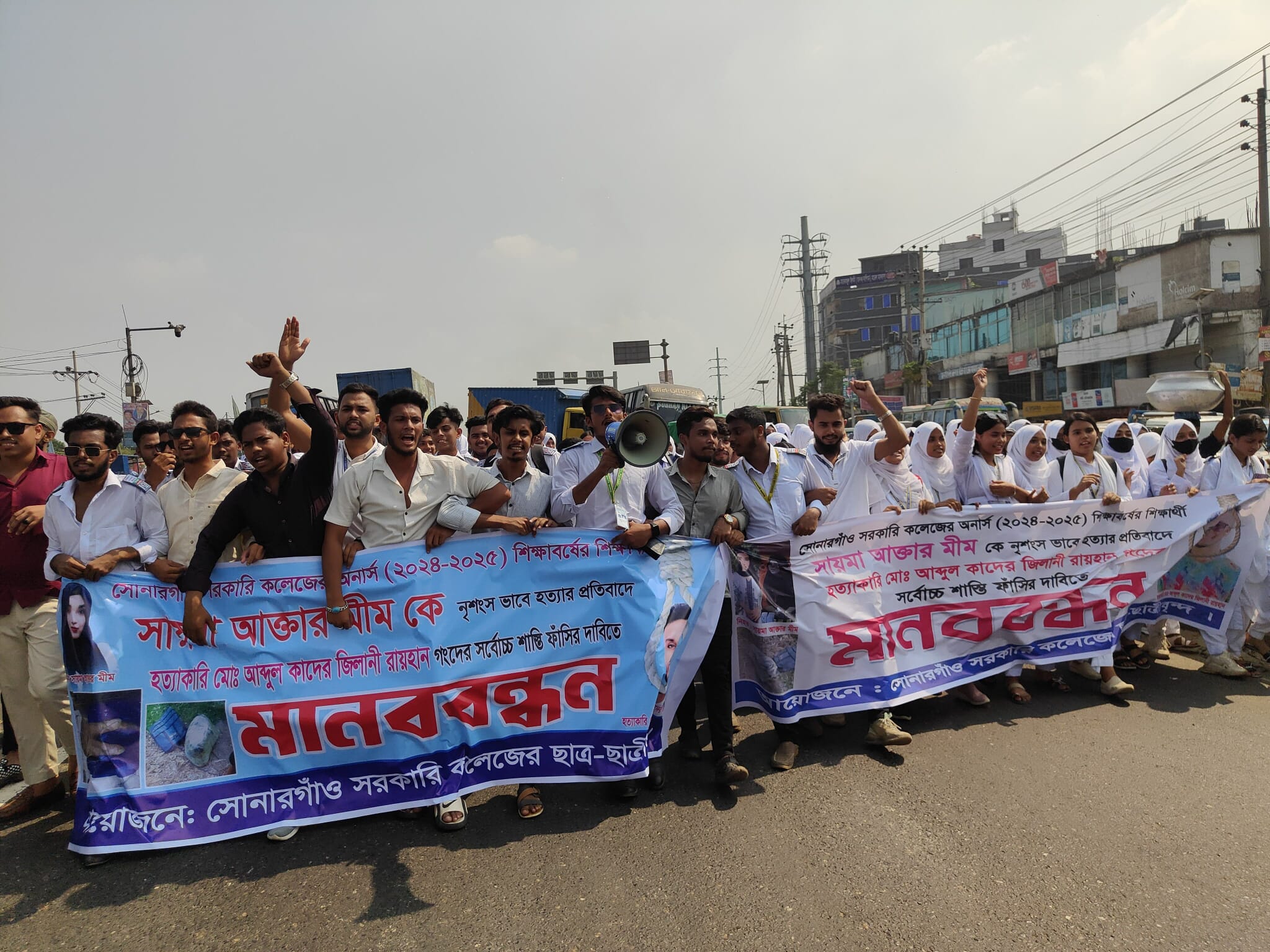 সোনারগাঁ সরকারি কলেজের রাষ্ট্র বিজ্ঞান বিভাগের অনার্স দ্বিতীয় বর্ষের শিক্ষার্থী সায়মা আক্তার মীম(২২) হত্যাকান্ডে জড়িতদের দৃষ্টান্তমূলক শাস্তির দাবিতে মহাসড়ক অবরোধ করেছে শিক্ষার্থীরা। রোববার বেলা ১২টার দিকে ঢাকা-চট্টগ্রাম মহাসড়কের মোগরাপাড়া চৌরাস্তা এলাকায় সোনারগাঁ সরকারি কলেজের শিক্ষার্থীরা মহাসড়ক অবরোধ করে। আধাঘন্টার অররোধে মহাসড়কের ঢাকাগামী লেনে সকল প্রকার যান চলাচল বন্ধ হয়ে যায়। এর আগে তারা কলেজের প্রধান ফটকের সামনে একই দাবিতে মানববন্ধন কর্মসূচি পালন করে।