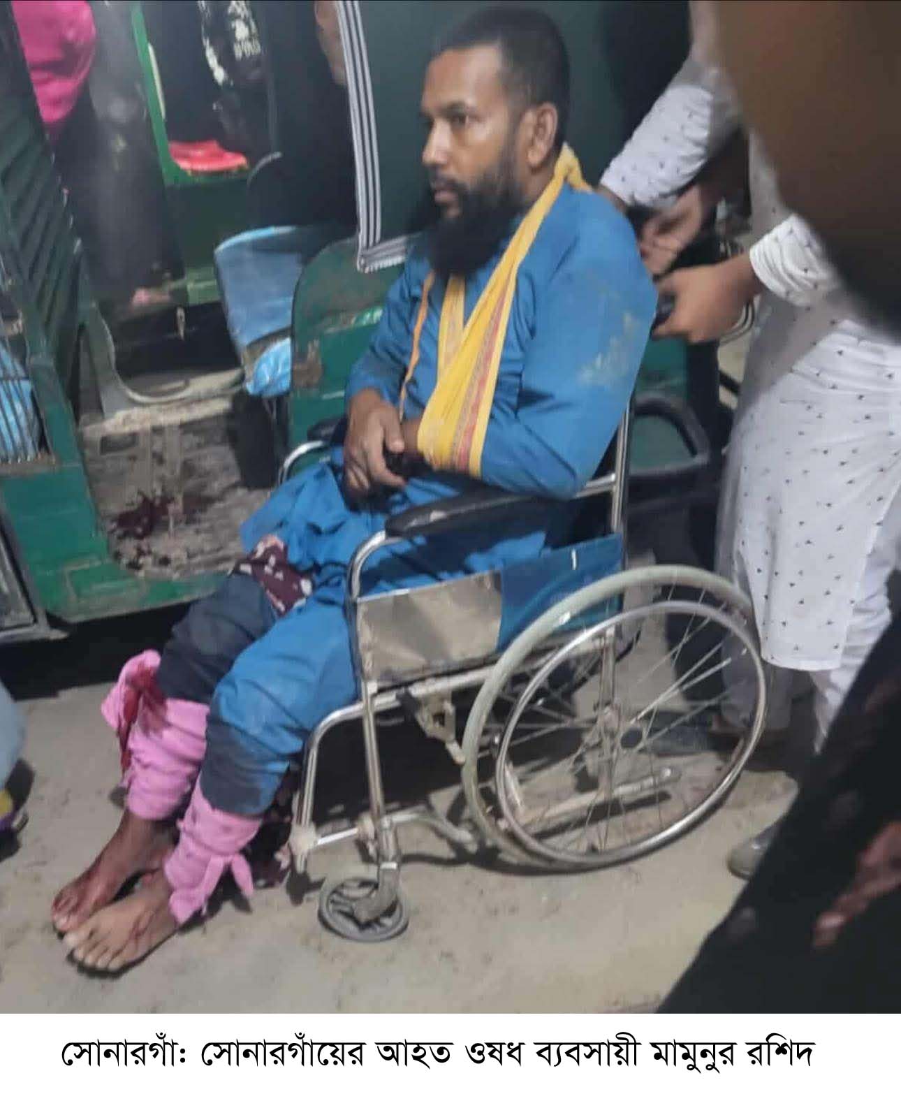 জানা যায়, উপজেলার নোয়াগাঁও ইউনিয়নের চৌরাপাড়া পাচআনী পাড়া এলাকার মোতালিব মিয়ার ছেলে ওষুধ ব্যবসায়ী মামুনুর রশিদ জামপুর ইউনিয়নের তালতলা বাজারে ফার্মেসীতে ওষধের ব্যবসা পরিচালনা করেন। ২০২৪ সালের আগষ্ট মাসে তাদের বিল্ডিং নির্মাণকালে তার কাছে একই গ্রামের মন্না মিয়ার ছেলে হারুন ও তার লোকজন ৫ লাখ টাকা চাদাঁ দাবী করে। এনিয়ে তাদের মধ্যে বিভিন্ন সময়ে কথাকাটাকাটি হয়। এর জের ধরে গত শনিবার রাতে মামুনুর রশিদ ফার্মেসী বন্ধ করে বাড়ি ফেরার পথে পূর্ব পরিকল্পিত ভাবে হারুনের নেতৃত্বে আসিফ, রায়হান, সুমন, সোহাগ, সেলিমসহ ৮-১০জনের একটি দল দেশীয় অস্ত্র নিয়ে হামলা চালায়। এসময় তার হাত-পা ভেঙ্গে কুপিয়ে মারাত্মকভাবে জখম করে। এসময় তার ডাক চিৎকারে আশপাশের লোকজন এসে তাকে উদ্ধার করে সোনারগাঁ উপজেলা স্বাস্থ্য কমপ্লেক্সে নিয়ে যায়। পরে তার অবস্থার অবনতি হলে তাকে ঢাকা মেডিকেল কলেজ হাসপাতালে ভর্তি করে।
