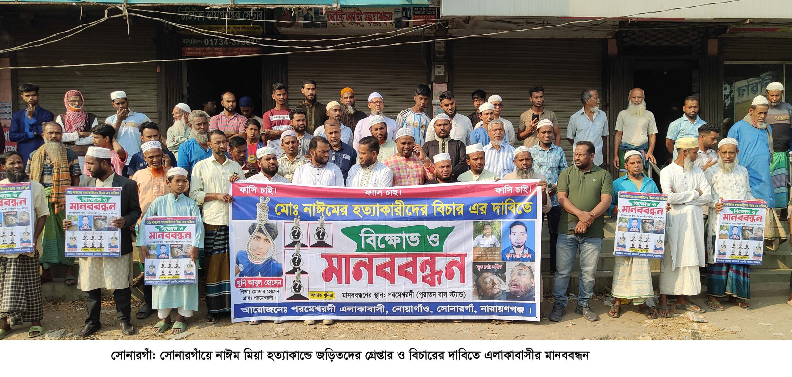 নারায়ণগঞ্জের সোনারগাঁয়ে নাঈম মিয়া হত্যাকান্ডে জড়িতদের গ্রেপ্তারের দাবিতে মানববন্ধন ও বিক্ষোভ মিছিল করেছে এলাকাবাসী। গতকাল শুক্রবার বিকেলে উপজেলার নোয়াগাঁও ইউনিয়নের পরমেশ্বরদী এলাকায় এ মানববন্ধন অনুষ্ঠিত হয়। এতে ওই এলাকার কয়েক’শ নারী পুরুষ অংশ নেন। মানবন্ধন কর্মসূচিতে নাঈম হত্যাকান্ডে জড়িতদের দ্রæত গ্রেপ্তার করে সর্বোচ্চ শাস্তির দাবি জানিয়েছেন বক্তারা।