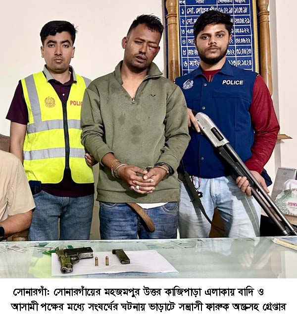 সোনারগাঁ থানার ওসি মহিববুল্লাহ বলেন, সংঘর্ষের খবর পেয়ে ঘটনাস্থলে পুলিশ পাঠানো হয়েছে। ঘটনাস্থল থেকে স্থানীয়রা একজন ভাড়াটে সন্ত্রাসীকে গণধোলাই দিয়ে পুলিশে দেয়। তার কাছ থেকে পিস্তল, ম্যাগজিন ও দুই রাউন্ড গুলি উদ্ধার করা হয়েছে। তাকে পুলিশ পাহাড়ায় ঢামেকে চিকিৎসা দেওয়া হচ্ছে। এ ঘটনা মামলা প্রক্রিয়াধীন।