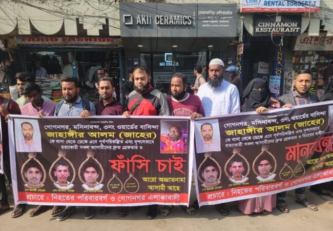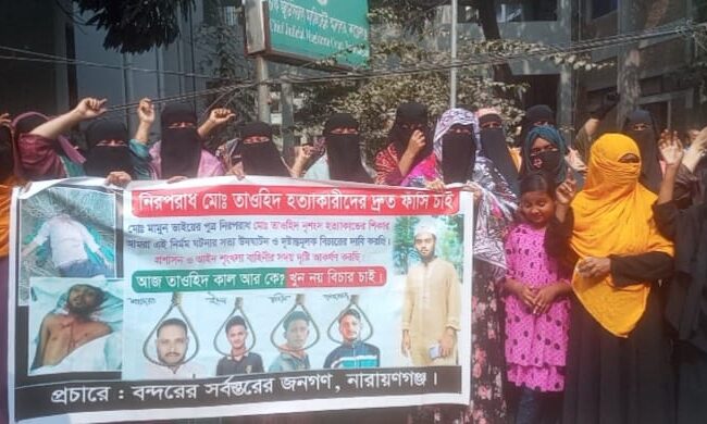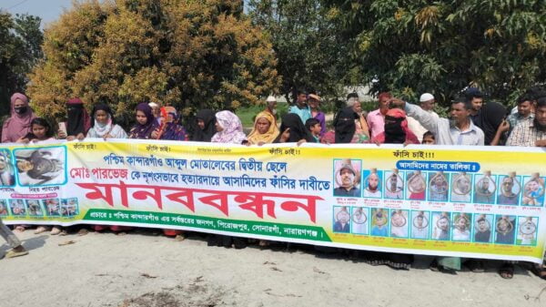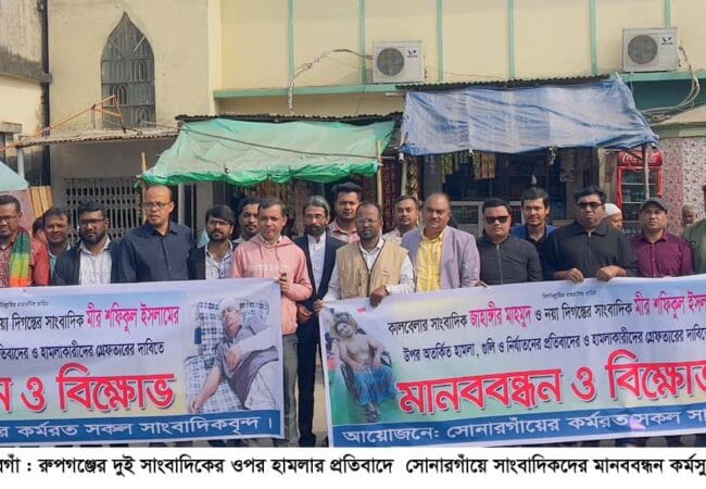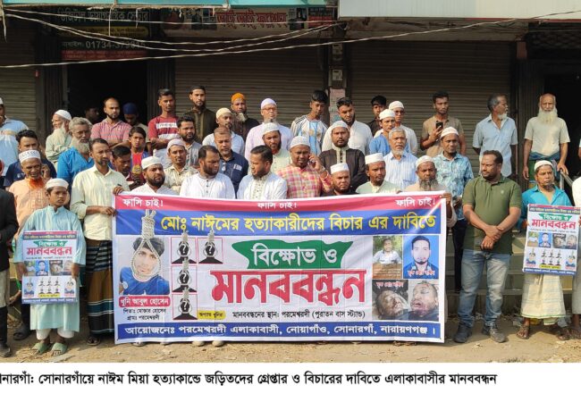 সোনারগাঁ প্রতিনিধি : নারায়ণগঞ্জের সোনারগাঁয়ে নাঈম মিয়া হত্যাকান্ডে জড়িতদের গ্রেপ্তারের দাবিতে মানববন্ধন ও বিক্ষোভ মিছিল করেছে এলাকাবাসী। গতকাল শুক্রবার বিকেলে উপজেলার নোয়াগাঁও ইউনিয়নের পরমেশ্বরদী এলাকায় এ মানববন্ধন অনুষ্ঠিত হয়। এতে... বিস্তারিত...